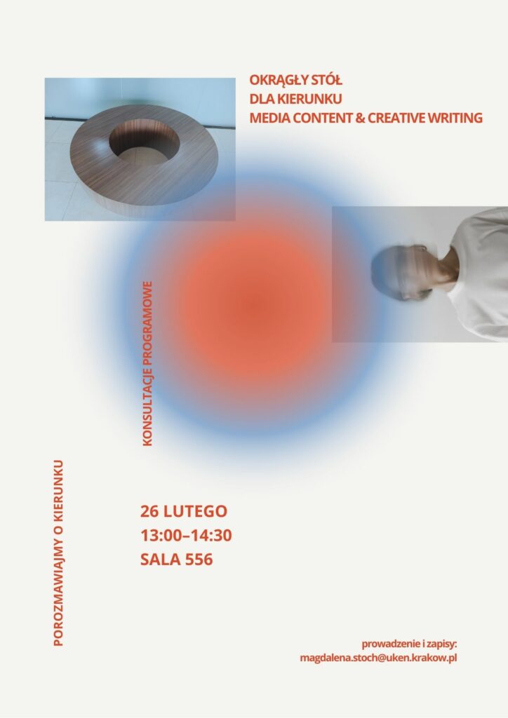 Okrągły stół to formuła rozmowy, której celem jest wspólne omówienie planowanych modyfikacji dwóch ścieżek kształcenia na kierunku Media Content and Creative Writing: medialno-komunikacyjnej oraz twórczo-krytycznej. Zakładamy partnerską, otwartą wymianę doświadczeń związanych z realizacją programu studiów – jego czytelnością, spójnością oraz dopasowaniem do różnych trajektorii rozwoju akademickiego i zawodowego.