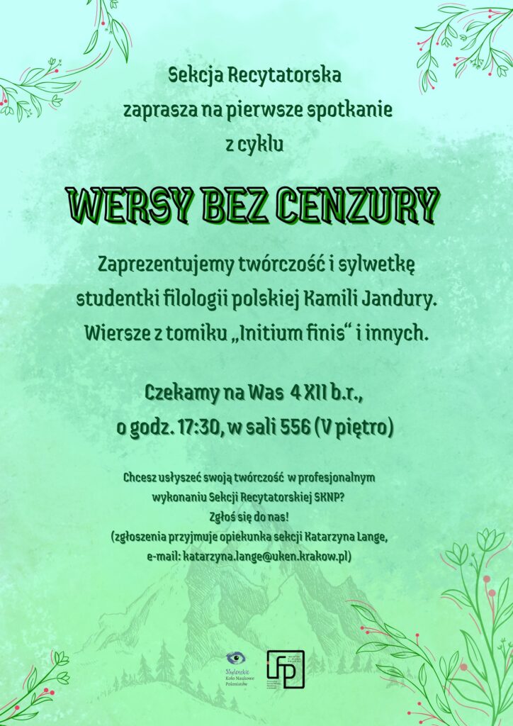 Drodzy, drogie! W imieniu Sekcji Recytatorskiej serdecznie zapraszamy na pierwsze spotkanie z cyklu WERSY BEZ...